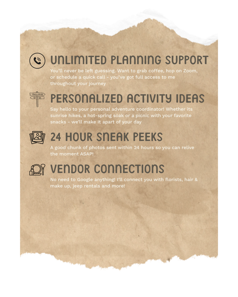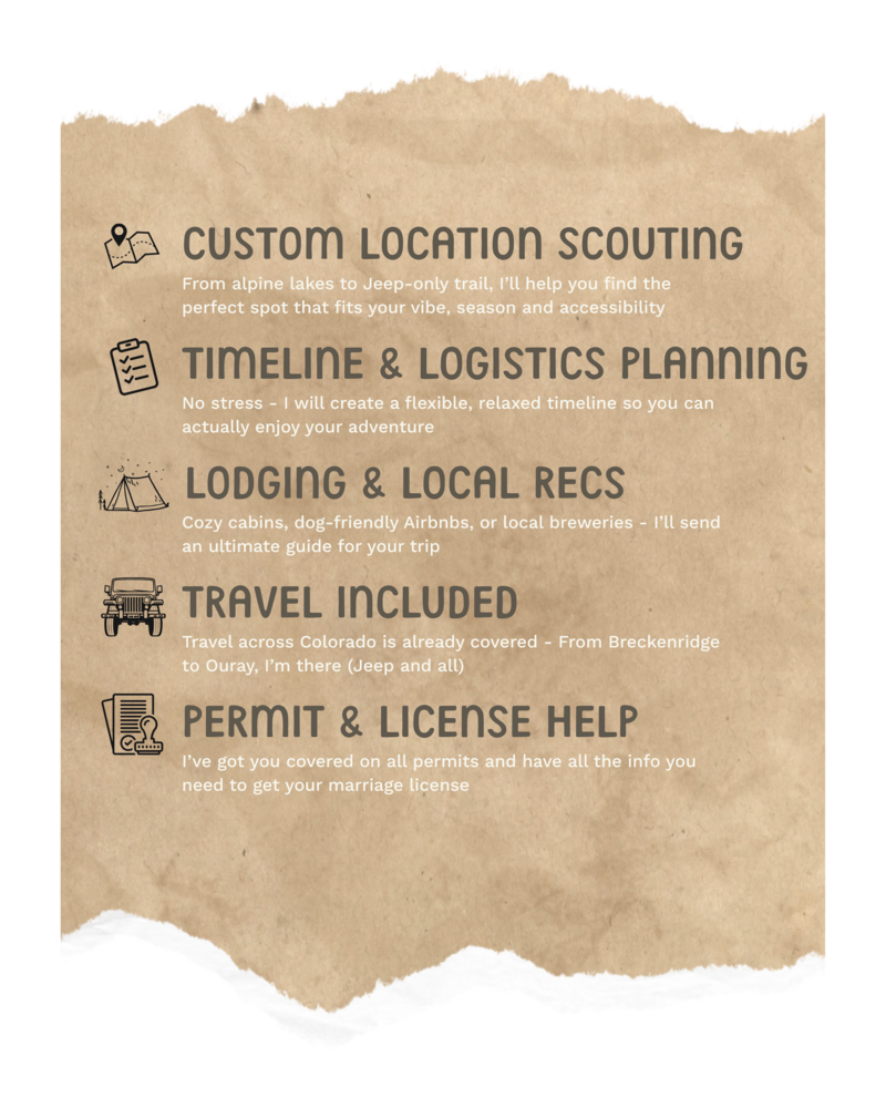 I’ll dive into location scouting, brainstorm activities, fine-tune your ideas, and help design an elopement day that’s 100% you—from start to finish.